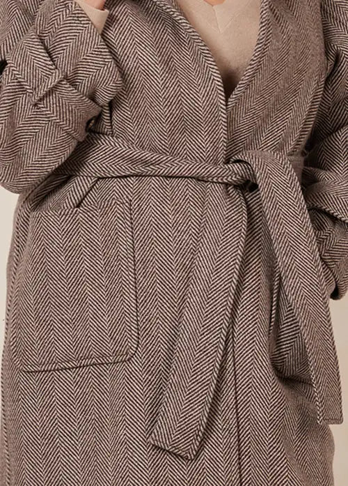 Cuando soplen los vientos invernales, envuélvete en la calidez de un abrigo tradicional de espiga de mezcla de lana y un estilo tradicional. Los tonos terrosos de Coco evocan recuerdos de la recolección de castañas de Indias y hojas caídas. Este abrigo hasta la rodilla de MELYR combina elegancia y comodidad con una facilidad sin esfuerzo. Lo suficientemente holgado como para agregar un suéter grueso y botas para paseos de fin de semana, lo suficientemente elegante como para combinarlo con una camisa elegante y una sastrería contemporánea para una ropa de trabajo elevada. Los hermosos bolsillos de parche profundos, las solapas alargadas y el elegante detalle de las mangas realzan un abrigo de lana increíblemente simple. Llévalo abierto para una prenda relajada y despreocupada, abotónalo para protegerte del frío helado y agrega el cinturón a juego para una cintura ceñida. Combínalo con los pantalones Amalfi MELYRFLEX y el punto de cachemira Helena para una elegancia cotidiana.